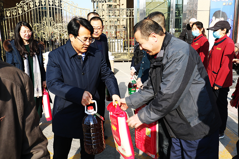 2月8日,市惠民公司黨委委員、總經(jīng)理胡紅訓(xùn),副總經(jīng)理王徐周、鄭忠軍、馬新平、王彥彥分組帶領(lǐng)黨委辦(辦公室)和工會(huì)負(fù)責(zé)人深入惠通公司、新城國(guó)際物管站、柳湖路苗圃、新北嘉園物管站、惠民花園物管站、市委市政府物業(yè)服務(wù)中心、法院物業(yè)服務(wù)中心、平?jīng)鲑e館立體停車(chē)庫(kù)、惠民大廈物業(yè)服務(wù)中心,看望、慰問(wèn)了疫情防控和春節(jié)期間堅(jiān)守崗位的一線職工,向他們送去了慰問(wèn)品和新年祝福。