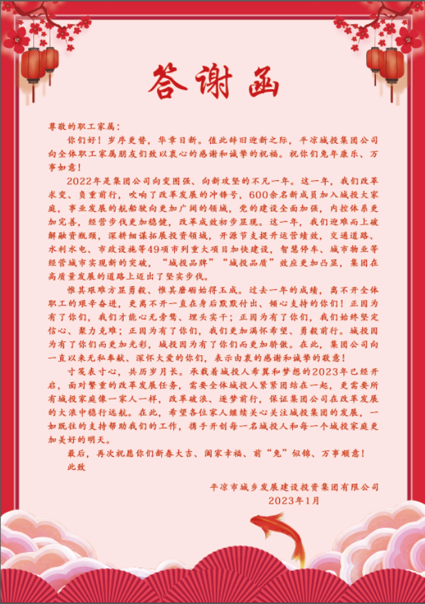 為感謝職工及職工家屬一年來的辛勤付出,架起公司與職工家屬溝通的橋梁,讓職工家屬更全面、深入地了解職工工作情況,更好地支持職工的工作,1月16日,平?jīng)龀峭都瘓F(tuán)召開2022年度職工家屬答謝會(huì)。公司中層管理人員、掛職干部、2022年度“城投標(biāo)兵”、先進(jìn)個(gè)人及一線職工等40余名職工家屬代表齊聚一堂,共話公司發(fā)展和職工個(gè)人成長。