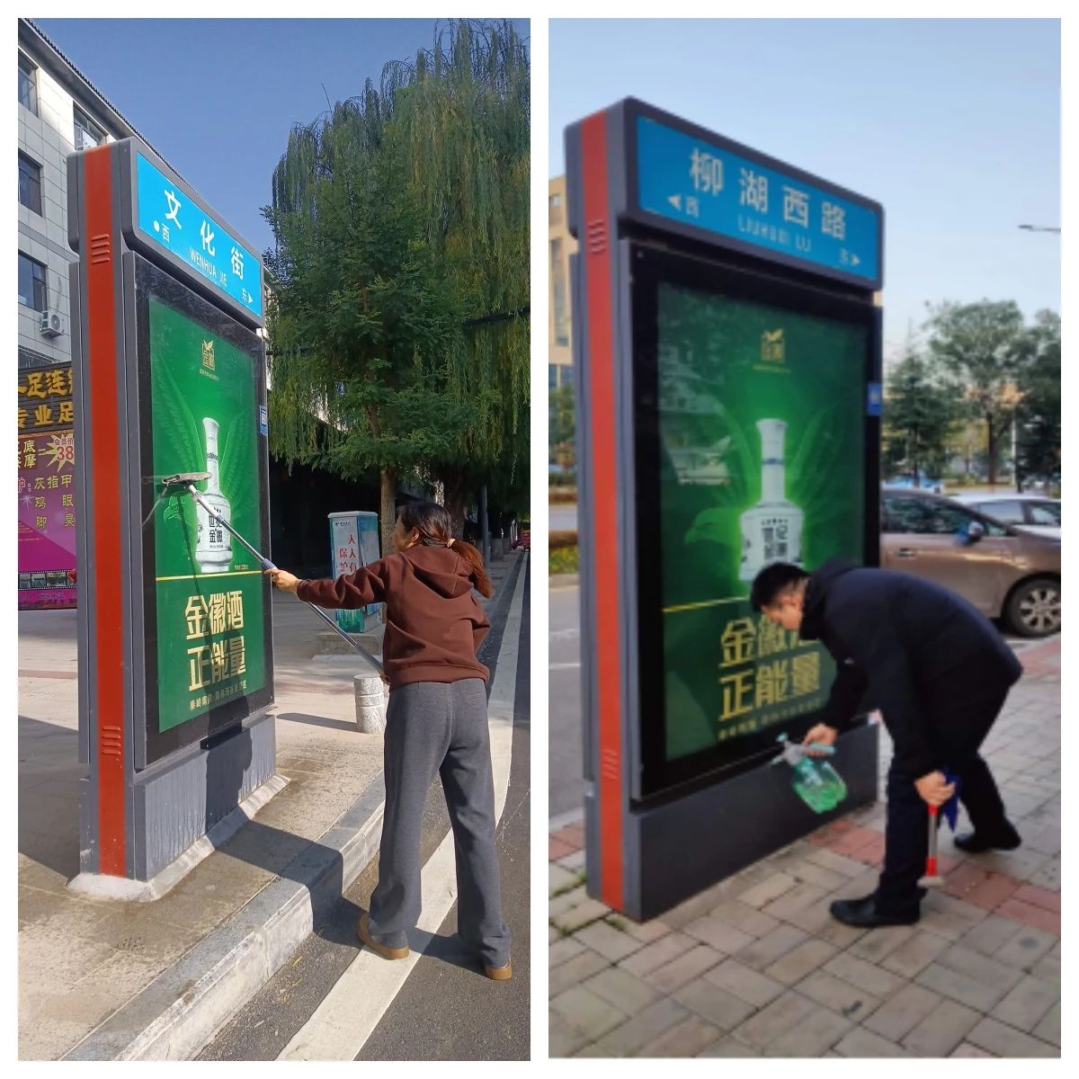 本次清洗維護活動,集中對中心城區(qū)主要街道、商業(yè)街區(qū)、交通樞紐等區(qū)域燈箱式道路指示牌進行全面清洗,對因道牙改造施工,道路鋪油形成的污點、垃圾進行全面清理,確保廣告設施的完好和宣傳效果。