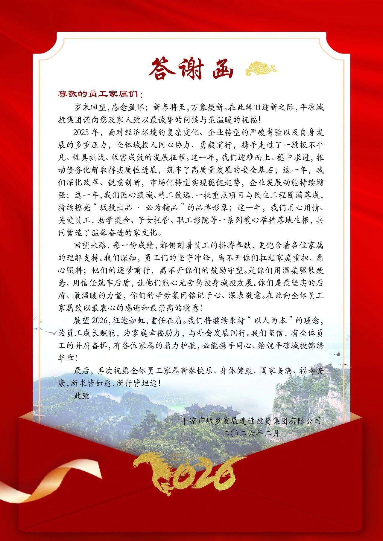 會上,集團公司向職工家屬代表們送上答謝函。集團公司黨委主要領導向職工家屬代表們?nèi)娼榻B了過去一年集團公司改革發(fā)展成就和2026年發(fā)展思路、重點,并與他們親切交談,向他們送去衷心的感謝和新春的祝福。參會家屬代表們對集團公司在平?jīng)龀鞘薪ㄔO、民生改善等方面作出的卓越貢獻給予高度評價,表達了對集團的美好祝愿,并表示將一如既往地做職工最堅實的后盾,主動分擔家庭責任,讓親人能卸下后顧之憂,全身心投入工作,為集團公司改革發(fā)展貢獻更多的力量。