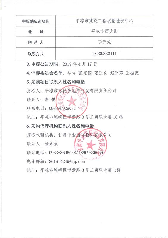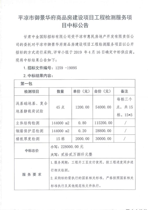 平?jīng)鍪杏叭A府商品房建設(shè)項(xiàng)目工程檢測服務(wù)項(xiàng)目中標(biāo)公告