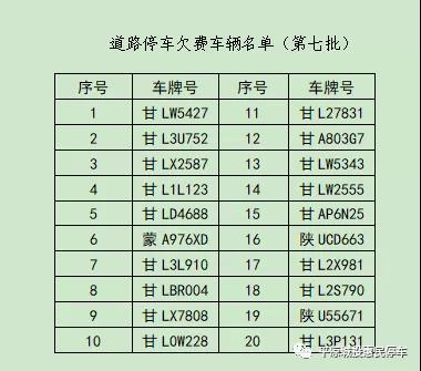 為了維護公平、公正、良好的停車秩序,我公司將2021年11月1日至2022年2月18日以來累計欠費金額較大的車輛信息匯總進行第七批公示(前六批公示車輛除外),請各位車主于2022年2月25日前及時補繳所欠停車費;逾期未補繳的,公司將欠費信息報送“信用崆峒”平臺公示;并對逾期仍未繳清欠費的車主通過法律途徑予以追繳,將會對個人征信產(chǎn)生嚴重影響。