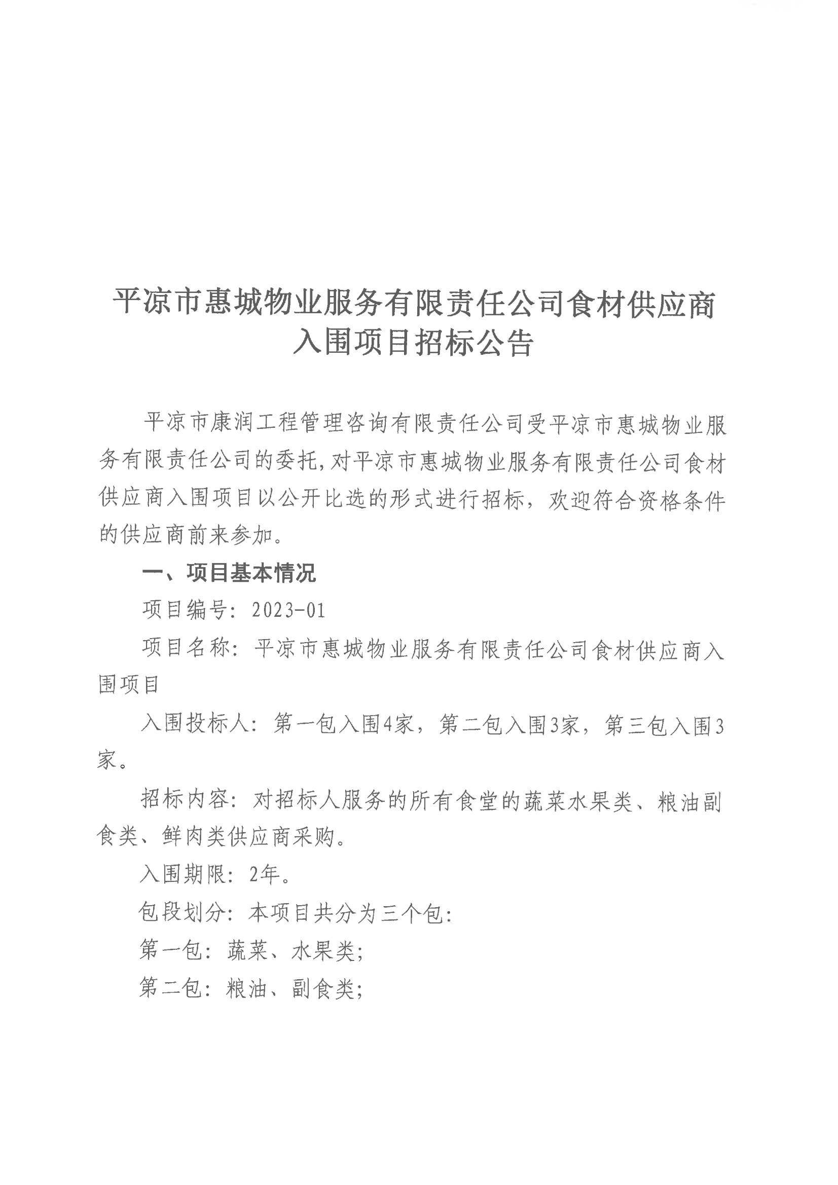 平?jīng)鍪谢莩俏飿I(yè)服務(wù)有限責(zé)任公司食材供應(yīng)商入圍項(xiàng)目結(jié)果公告